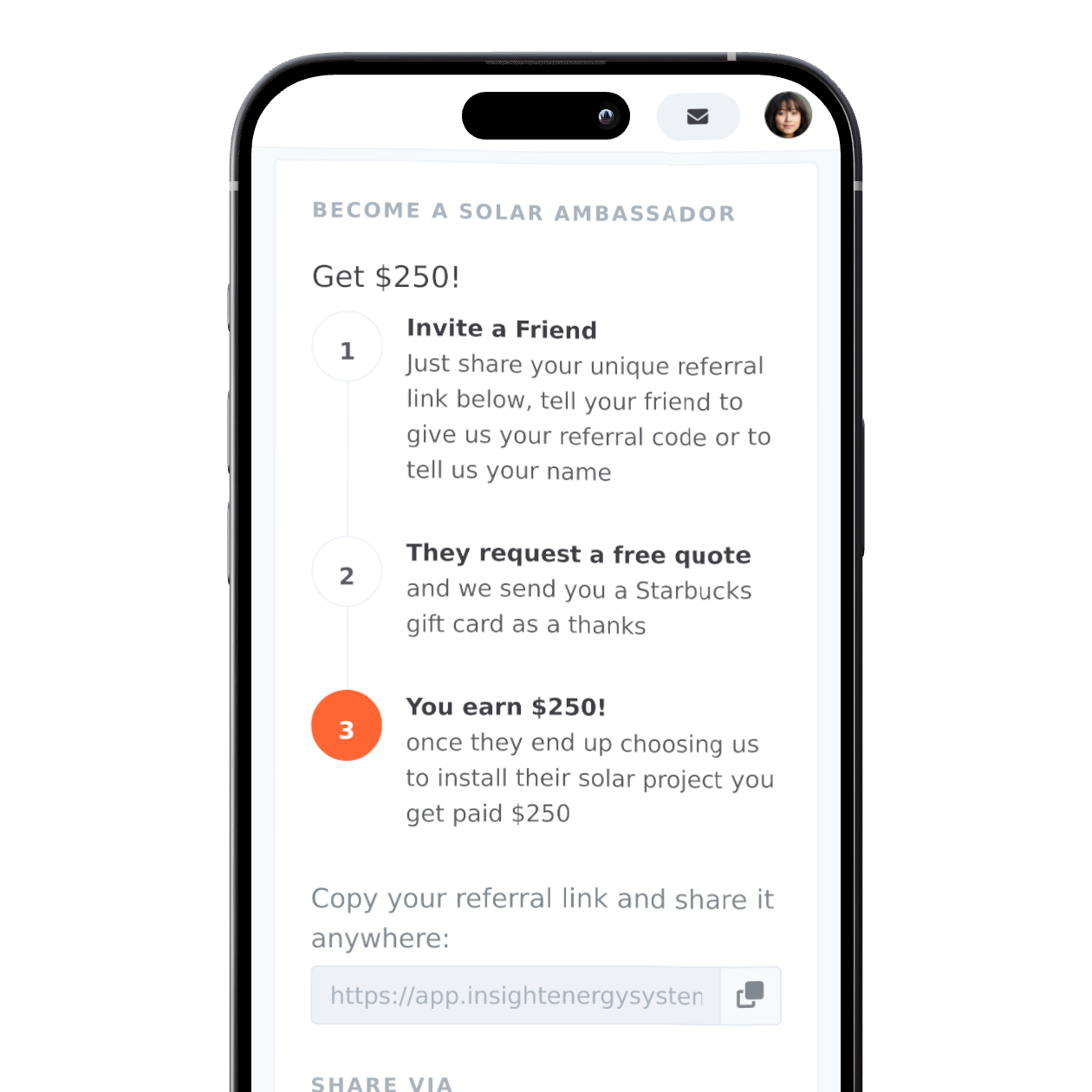 Have you been happy with Insight Energy? Refer a friend or family member conveniently by sending their contact info through the app or sharing your personalised referral page with them and earn money as a thank you.